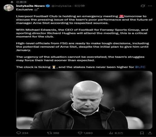 而來自轉會信息博主indykaila News的最新消息,利物浦將于明天召開緊急會議,專題討論球隊近期糟糕的表現以及主教練斯洛特的未來。